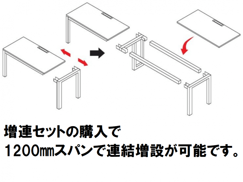 また、別売りの増連セットが用意されています。W1200スパンでの連結増連が可能になっており、長いスパンへの壁面設置や、片面フリーアドレスとしても活用する事が出来るようになります。■REVワークデスク用増連セット
