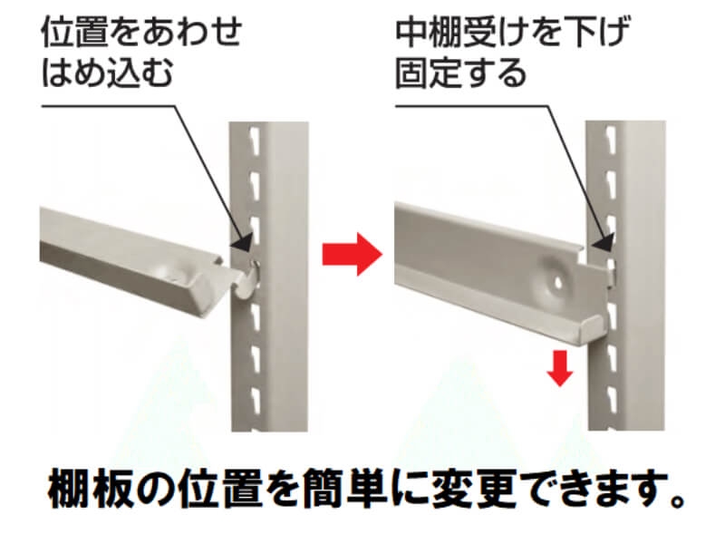 また、棚板も棚受け爪で固定する事が出来るため、スピーディーかつ簡単に棚板の間隔を調整する事が出来ます。