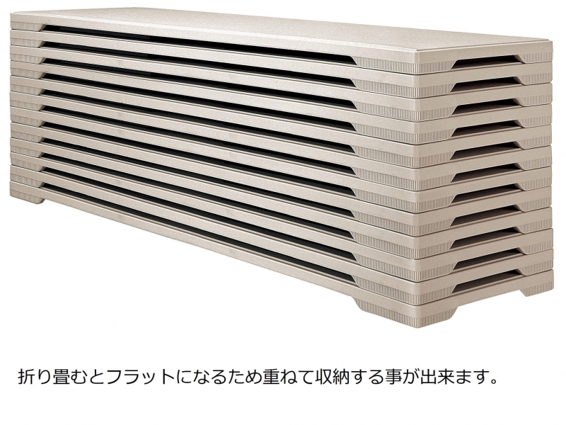 折り畳むと脚部が天板厚内に収まり、フラットになる設計のため、重ねて収納する事ができます。従来品に比べて、薄く、軽量になっており取り扱い易さが向上しています。