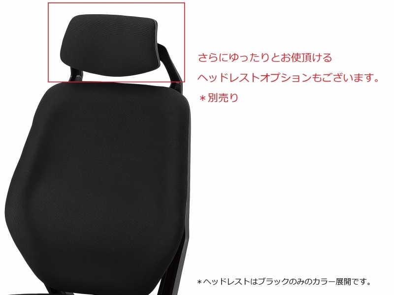 また、別売りオプションになりますが、ヘッドレストが用意されており、ハイバックの背もたれをさらに高くし、頭部までサポートする事ができるオプションとなっています。