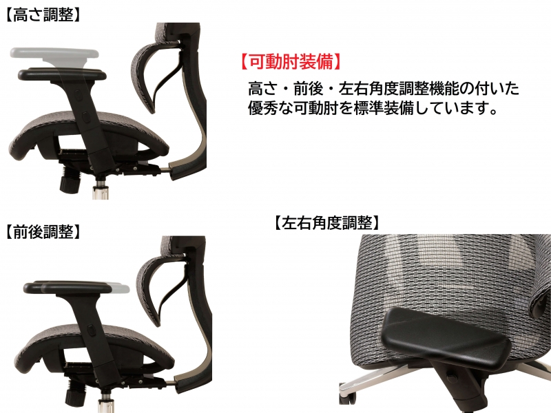 肘掛は可動肘となっており、「前後」「左右」「上下」に多彩な動きが可能なため、体格や姿勢によって好みのポジションに調整可能になっています。